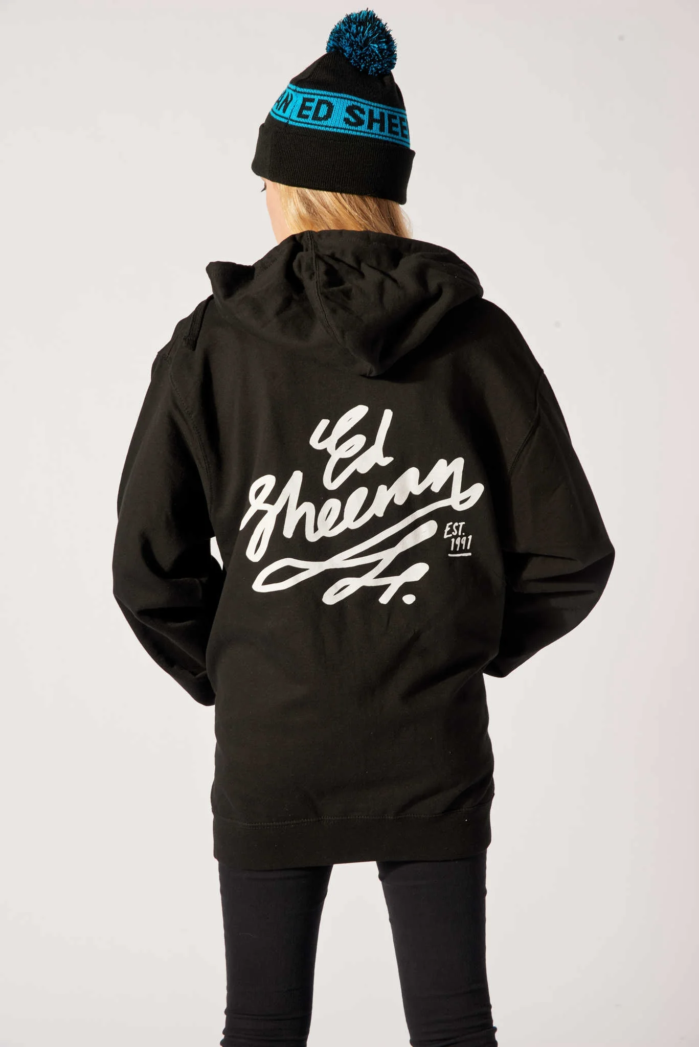 The Ed Sheeran Signwriter Slim Fit Zip Hoodie Black features "Ed Sheeran" printed in white script on the back and a small picture of the artist and his guitar on the front. The design is printed on an Independent Trading Company black slim-fit zip up hoodie. The sweatshirt is 80% cotton, 20% polyester.