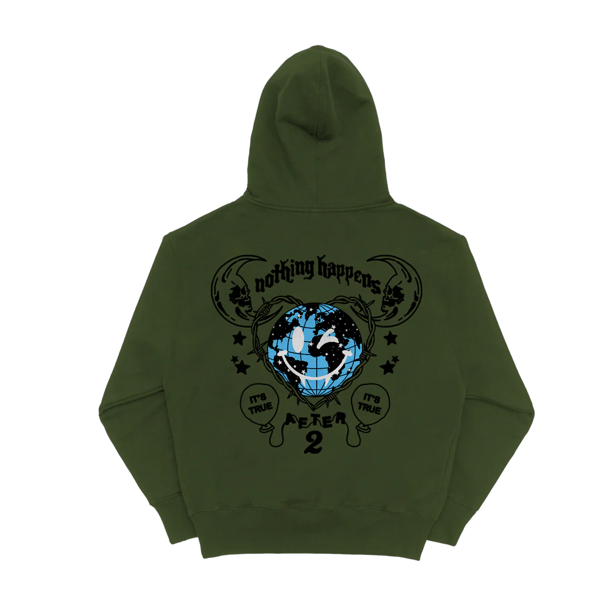 True After Green Hoodie featuring a front and back print in the creative direction of the single Bad Habits. This unisex green hoodie is printed on an environmentally friendly organic garment.